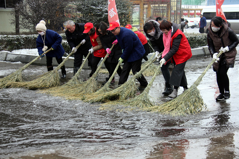 2月21日下午,一场大雪飘然而至,一夜之间,银装素裹。雪景虽美,却给矿井生产生活带来很大不便。2月22日一早,太平煤矿的百余名干部职工在政工科、工会办公室、后勤服务中心等部门的组织带领下,迅速从四面八方汇集到矿工业广场,拿起扫帚、铁锹等工具,投入到清冰除雪的"战场"。纪委书记兼工会主席邵作胜亲自现场指挥并带头参加劳动;各单位通力配合,备足铁锨、扫帚等工具;干部职工不畏严寒、分工协作,有的用铁锨清除地面结冰,有的用扫帚清扫积雪、积水,现场一片热火朝天的景象。