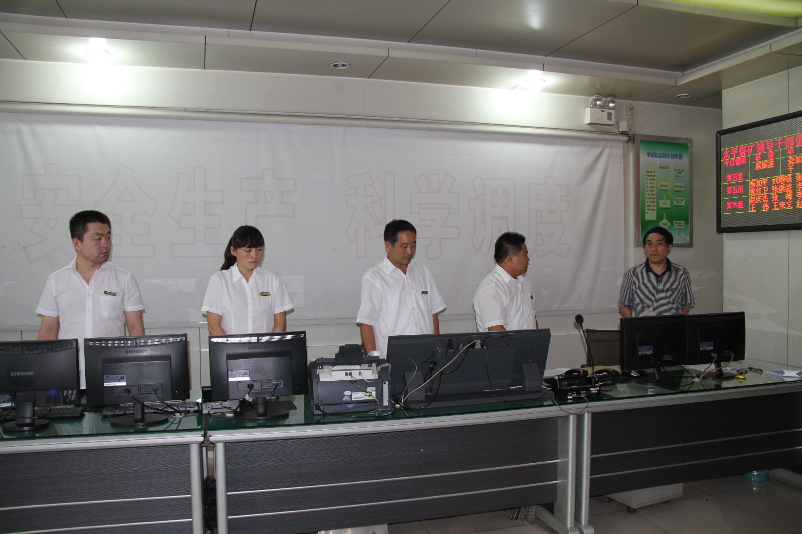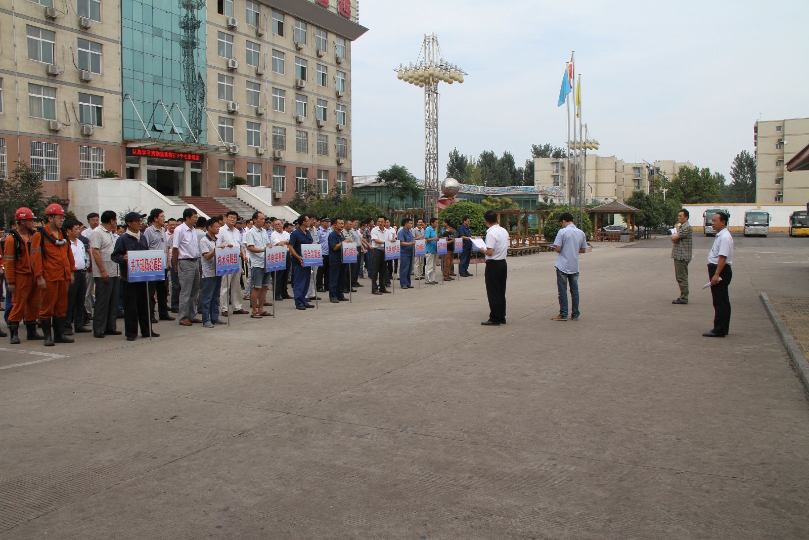 14时49分,现场处置组、技术保障组、机电控制组、安全监管组、通风监控组、秩序维护组、后勤保障组、医疗救护组、善后处理组、信息发布组等10个救援小组8分钟内在采掘楼前集结完毕。各小组组长到调度指挥中心集合。总指挥汤保民作出重要部署,要求各小组立即按照《煤尘爆炸事故应急救援预案》做好各自范围内的应急救援准备工作。各组人员立即按照要求迅速进入应急演练状态,并严格按职责分工投入到应急救援工作中。